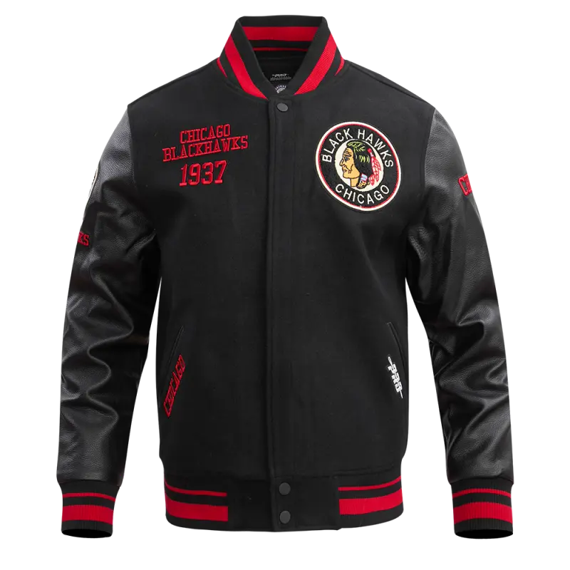 NHL CHICAGO BLACKHAWKS RETRO CLASSIC MEN’S RIB WOOL VARSITY JACKET (BLACK\/RED\/BLACK)