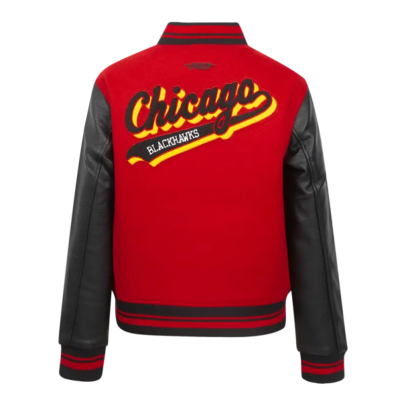 NHL CHICAGO BLACKHAWKS SCRIPT TAIL WOMEN’S WOOL VARSITY JACKET (RED\/BLACK)