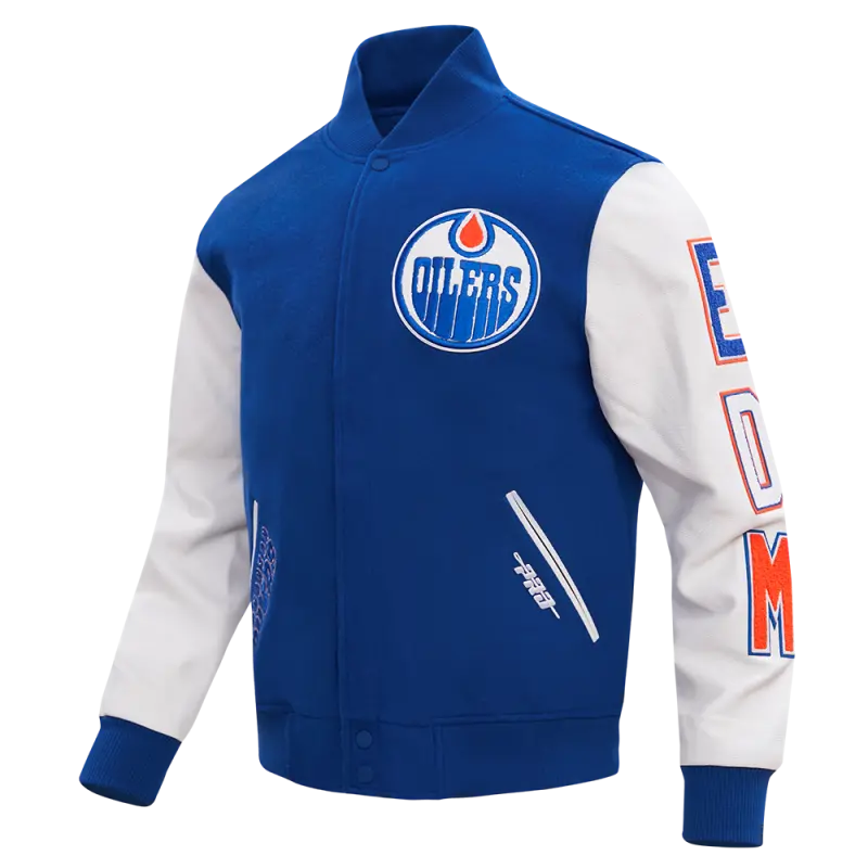 The Pro Standard Premium NHL Edmonton Oilers Classic Wool Men’s Varsity Jacket (Dodger Blue/White)