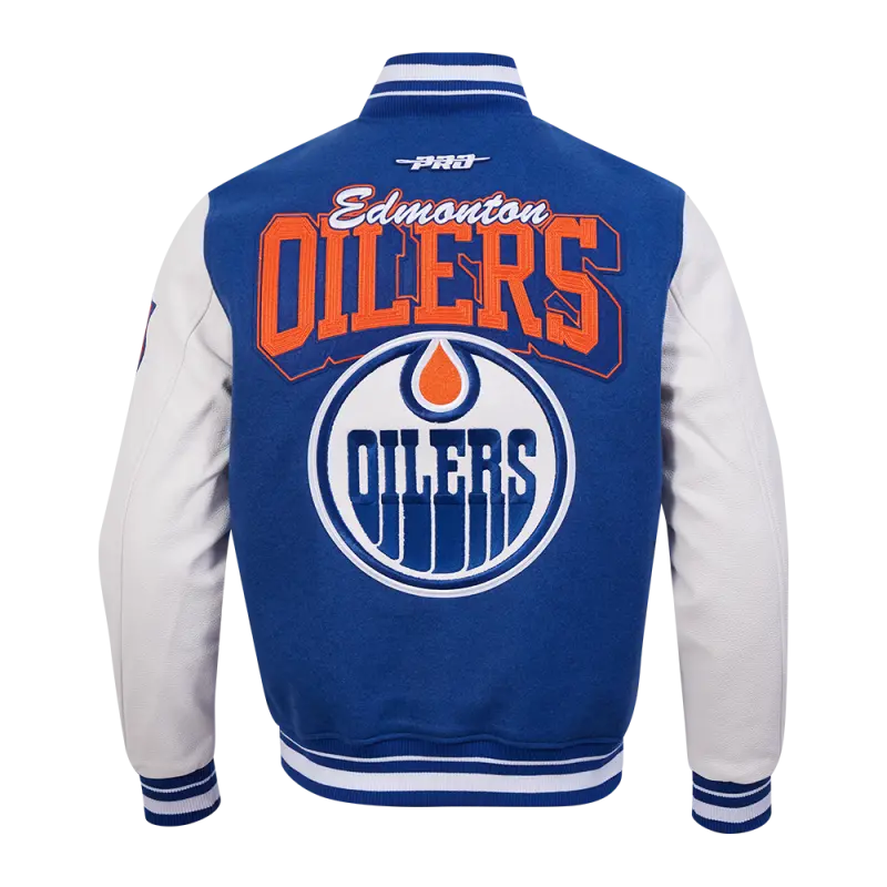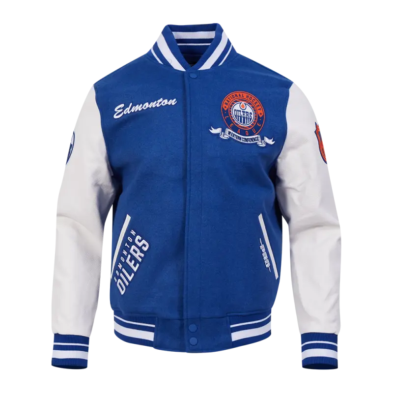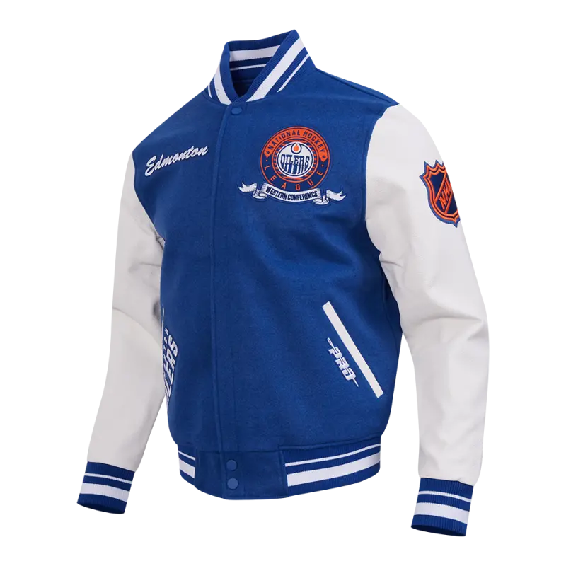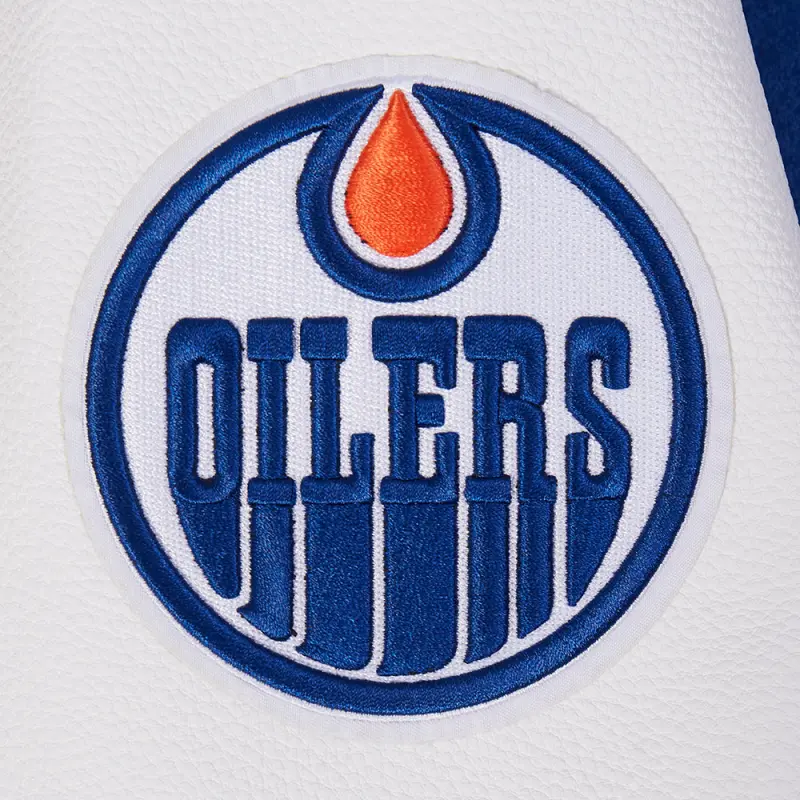 NHL EDMONTON OILERS TEAM BADGE MEN’S RIB WOOL VARSITY JACKET (DODGER BLUE\/WHITE)