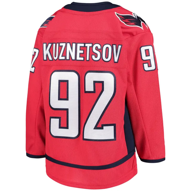 • Please Note: This product ships directly from the USA. Showcase your youngster's one-of-a-kind swagger and budding hockey fandom with this Washington Capitals Evgeny Kuznetsov Home Premier Player jersey. This piece of gear is just what your kiddo needs for their game day collection. This unique jersey will be a staple in your young fan's Washington Capitals wardrobe, with its bold design and crisp team graphics.